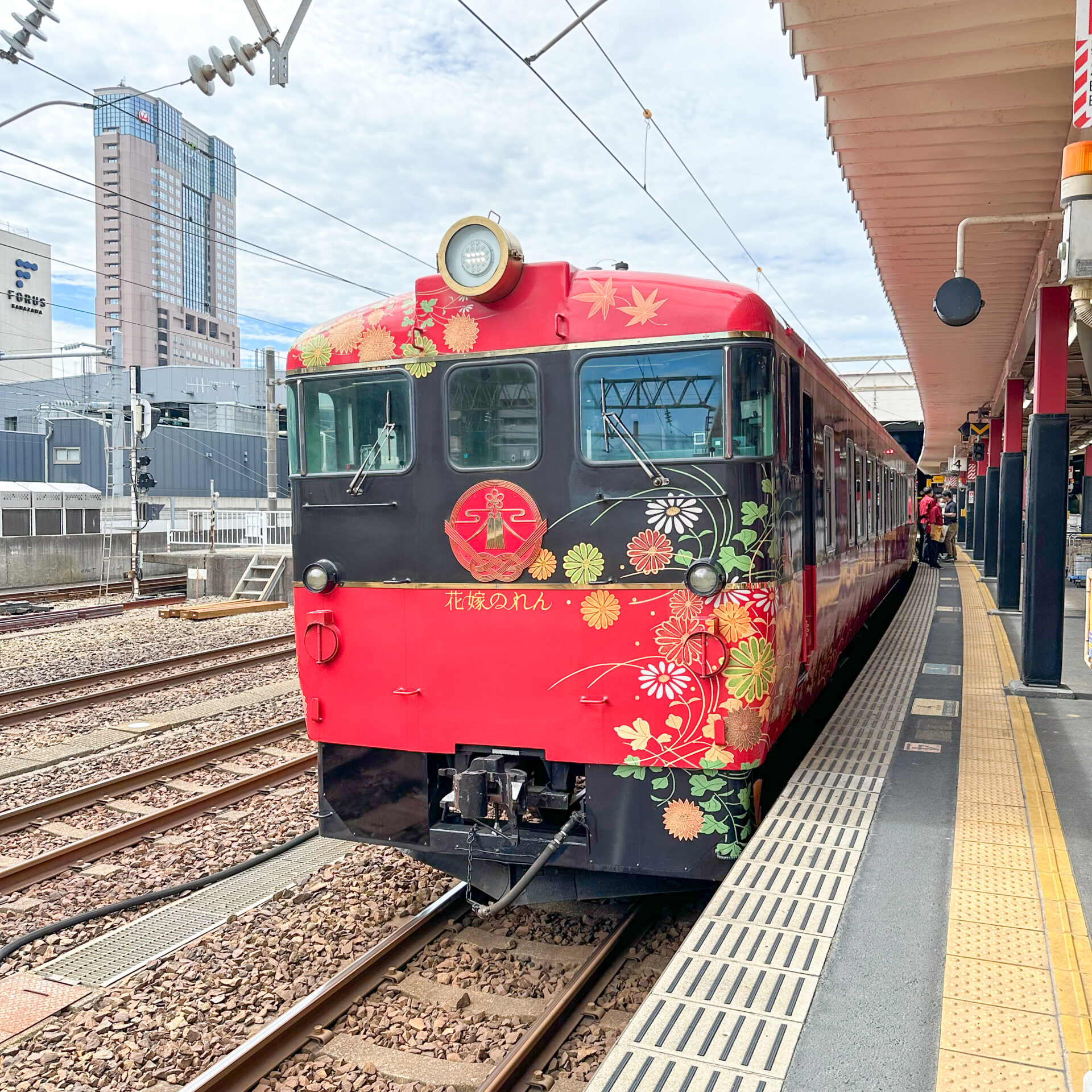 「花嫁のれん」の車両は、気動車のキハ48形の2両編成です。金沢駅では、2号車が手前になります。赤い車体に黒の帯が入っています。花柄の模様が描かれていて、とても美しいです。