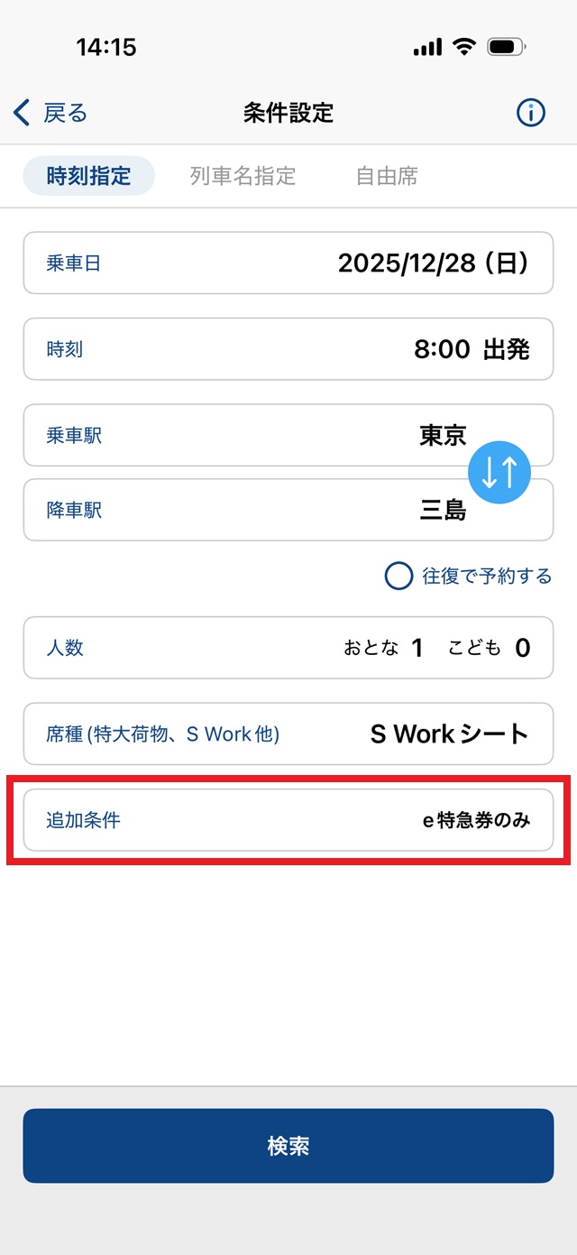 新幹線を新規予約する際、検索条件設定画面で乗車日・時間帯・乗車区間・人数を入力します。「e特急券」を購入するためには、「e特急券のみ」を追加条件として設定します。