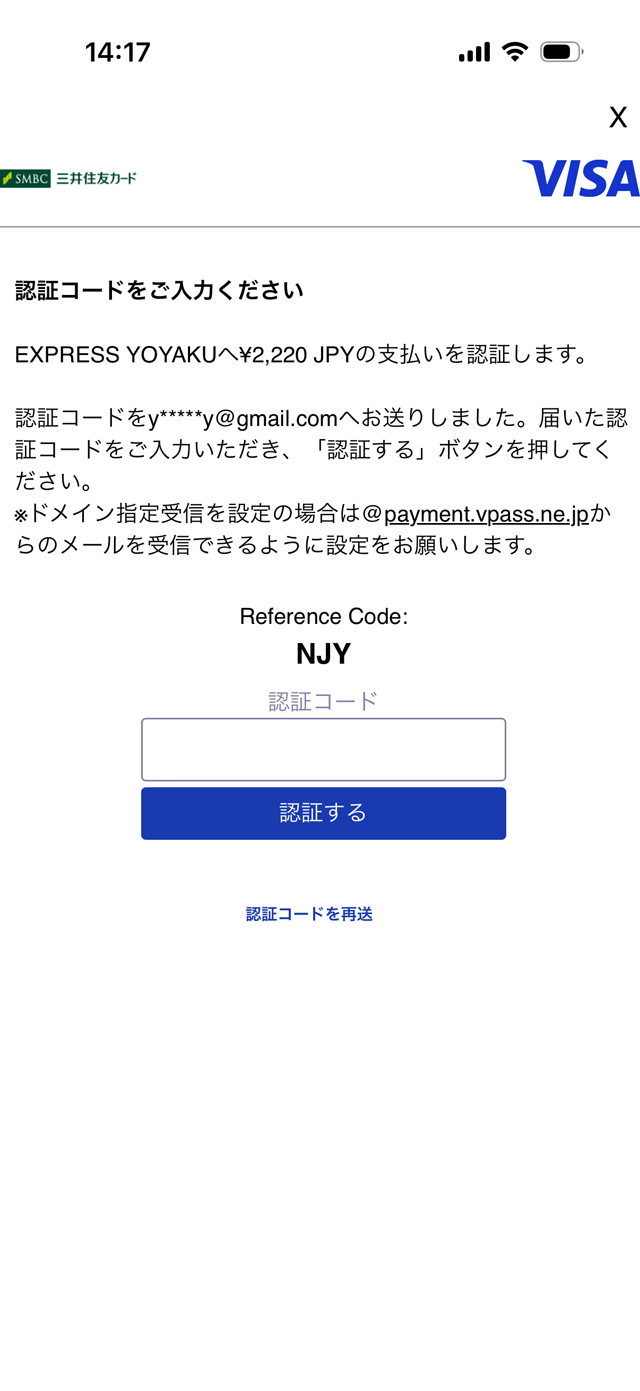 認証コードが「Vpass」アプリで登録したメールアドレス宛に届くので、メールに記載されたコードをこの画面で入力します。