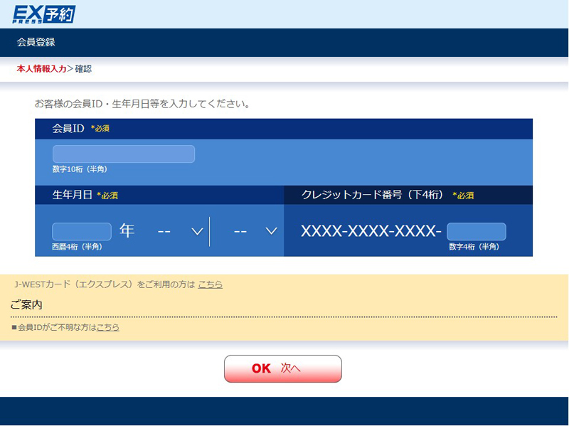 上述した会員ID・生年月日・クレカ番号を入力します。