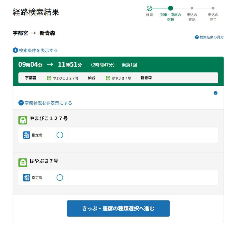 「はやぶさ・こまち」号の東京駅・盛岡駅間を利用する場合、指定券予約枠の充当が必須です。しかし、この区間には自由席が連結された「やまびこ」号が走っています。