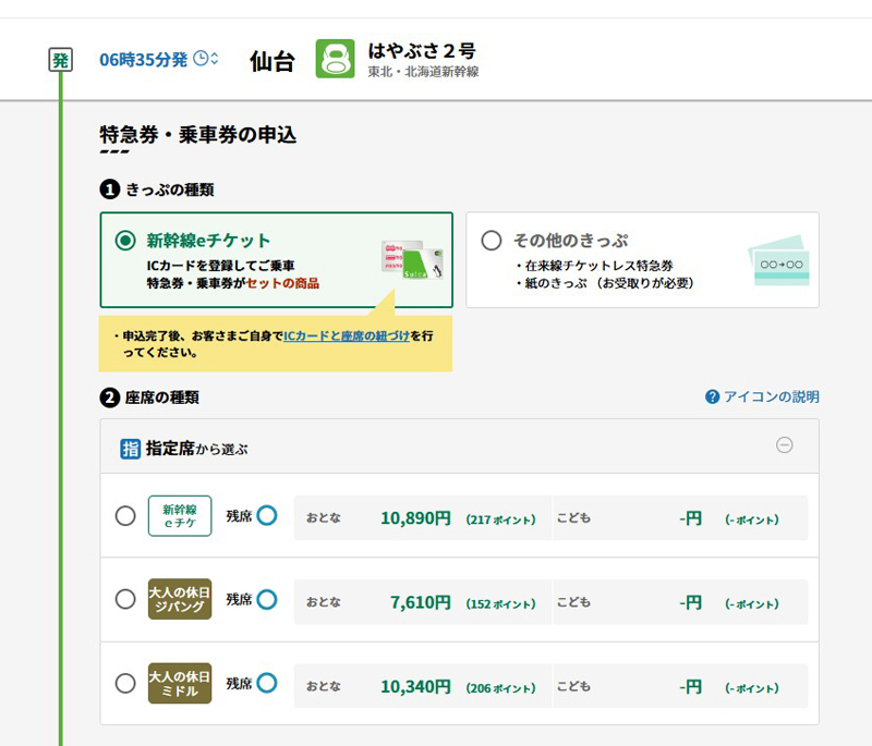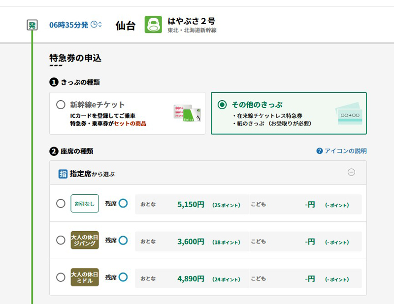 「えきねっと」上の購入画面では、仙台駅・大宮駅間については割引後の金額が表示されます。