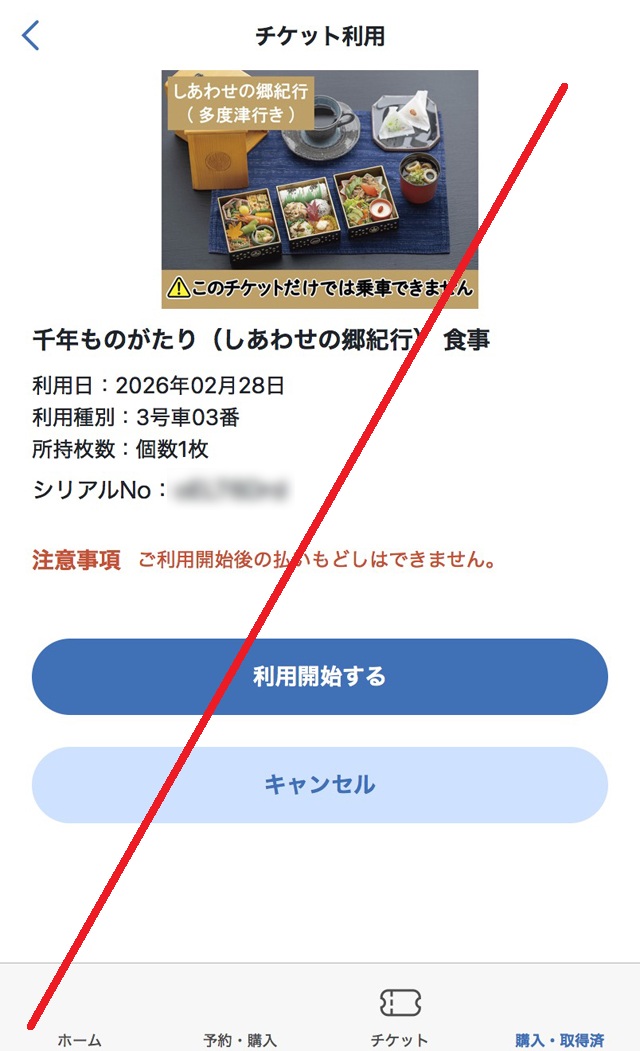 列車に乗車したら、デジタルチケットを使用開始します。するとデジタルチケットが表示されるので、アテンダントに提示します。
