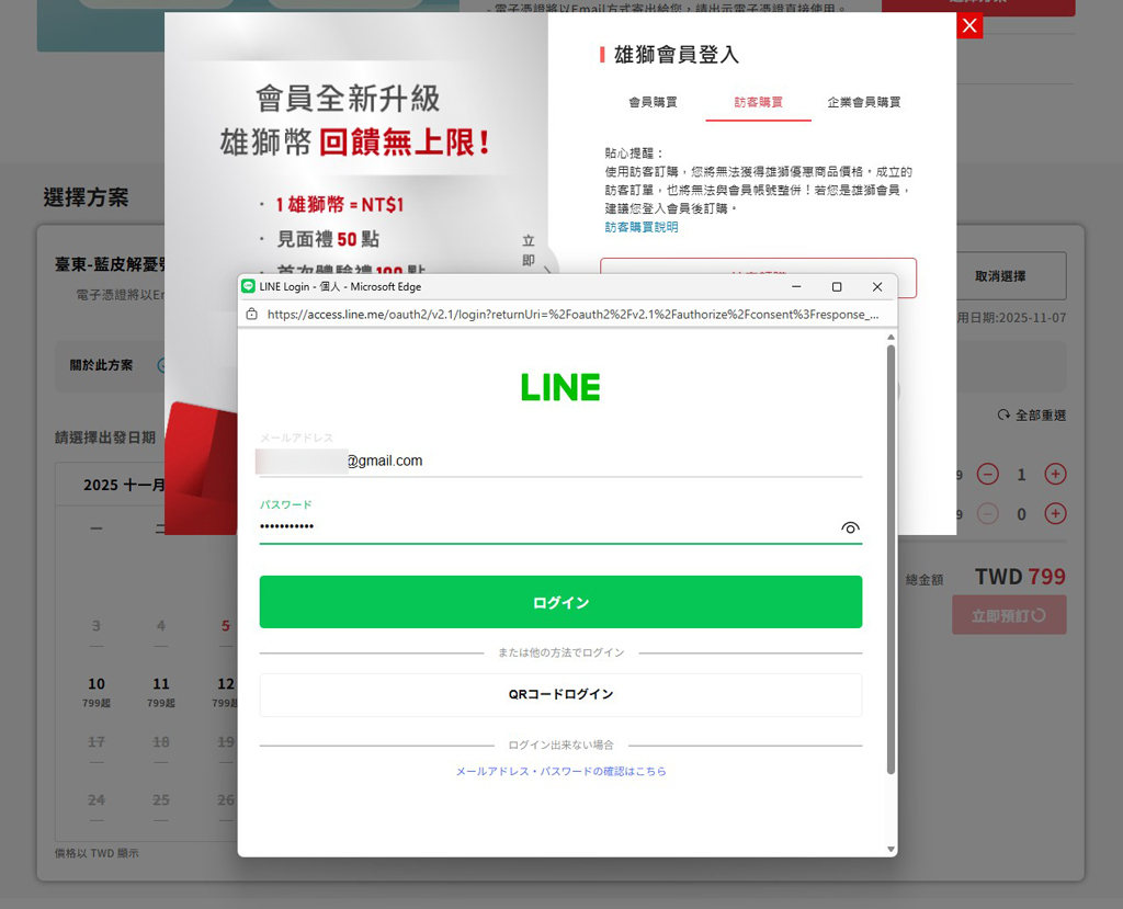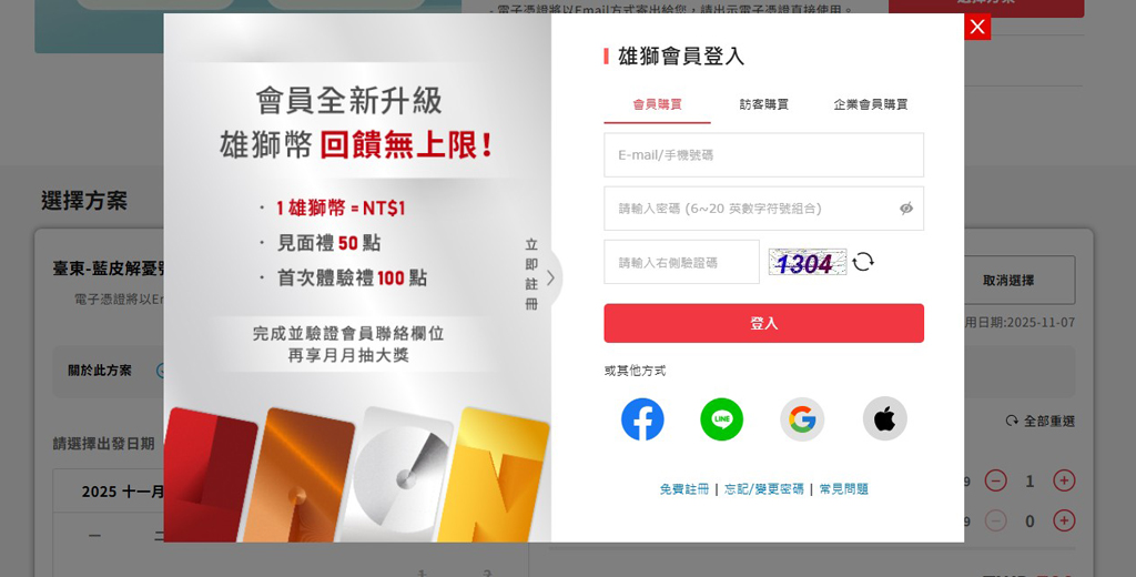 外国人向け旅行サイトでも申込できますが、思ったように予約が取れません。この観光列車の販売元「雄獅旅遊(Lion Travel)」のサイトで直接予約すると比較的予約しやすく、各SNS認証を使って比較的容易に申込できます!